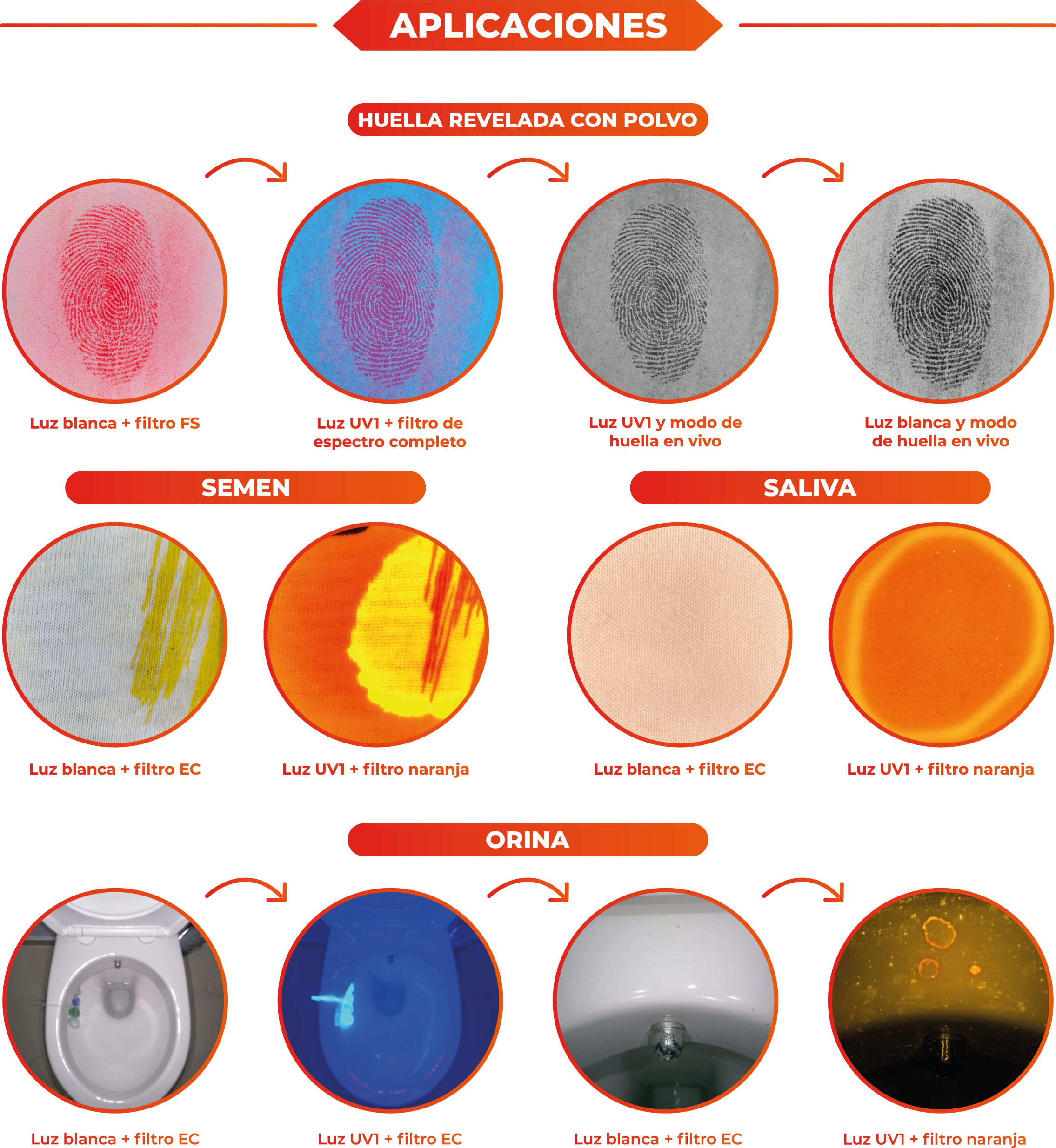 Capaz de detectar huellas reveladas, fluidos corporales, exámenes