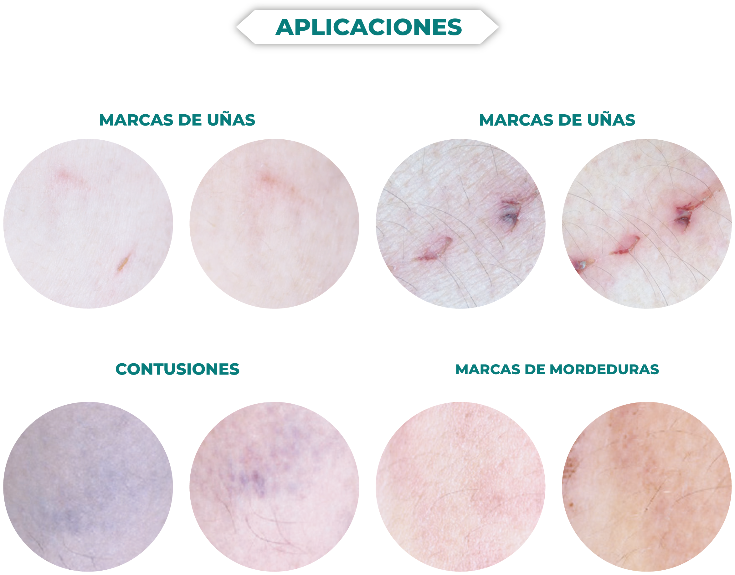 de uñas, moretones, marcas de mordeduras) y más.